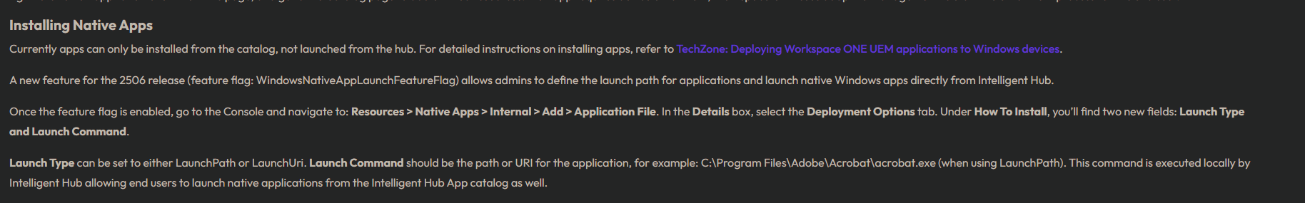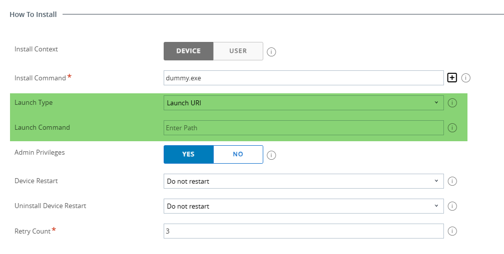 🔎 It was already known that it would be possible to run applications directly from the Intelligent Hub. What immediately piqued my interest, however, was when I saw that there was also a Launch URI command under the Deployment Options.