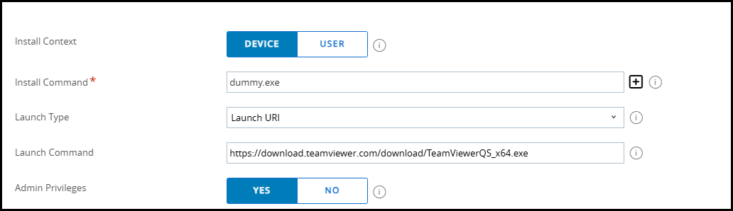 dummy.exefor the install command. Switching Launch Type to Launch Uri and the offical Teamviewer QuickSupport URL as Laucnh Command!